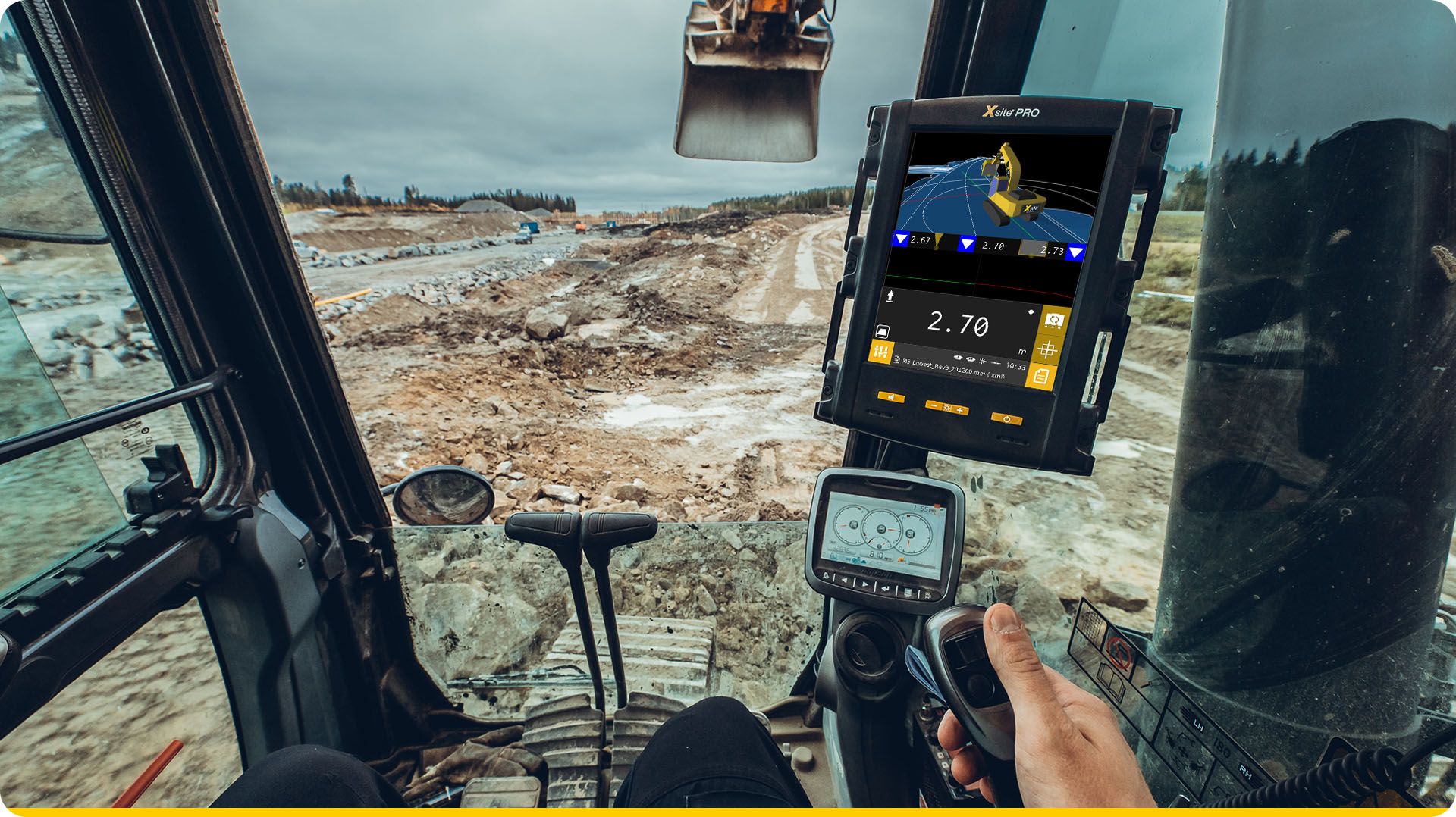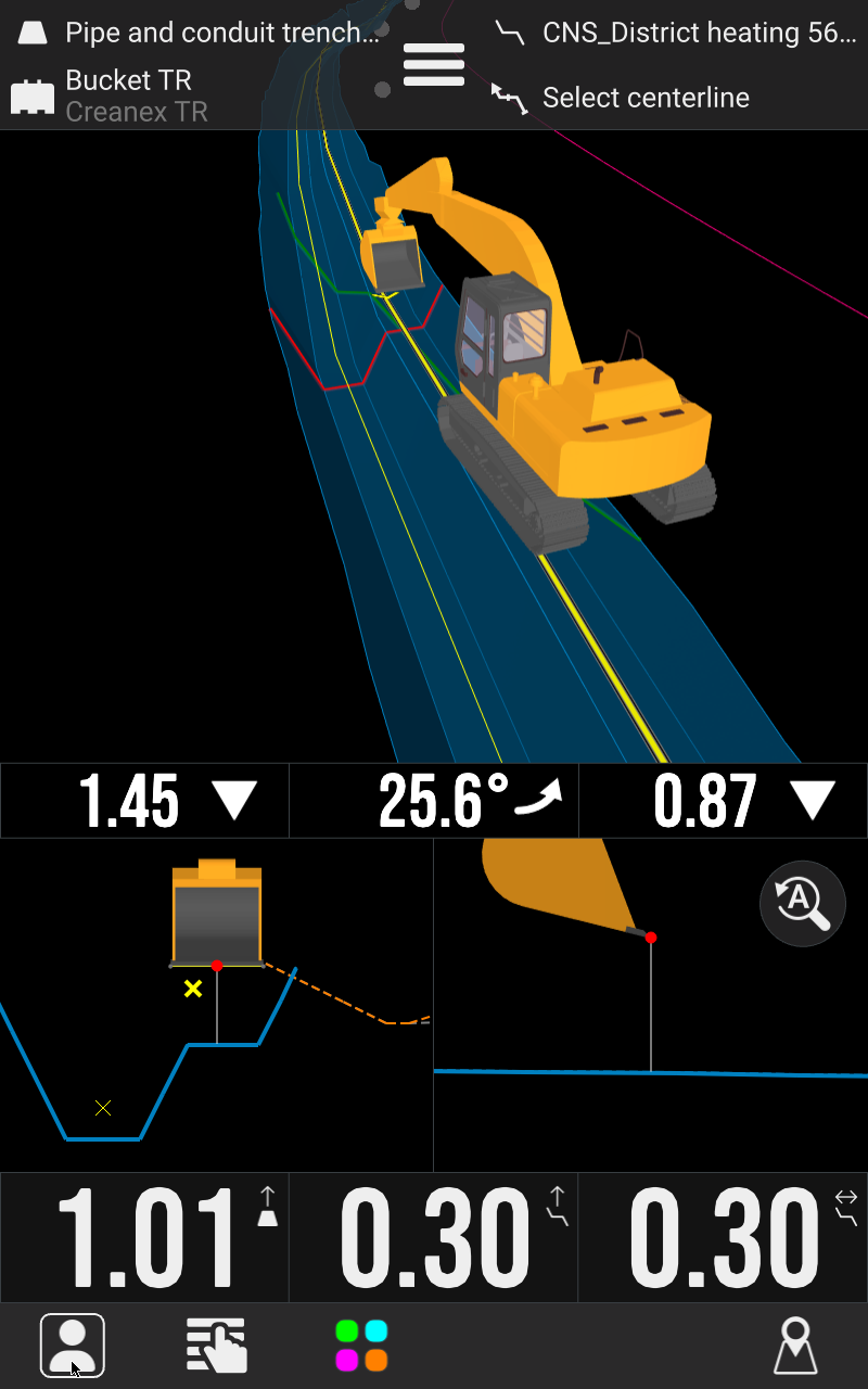 Operátor během kopání okamžitě vidí, jestli je nad, pod nebo přesně na plánované úrovni. To eliminuje potřebu opakovaného vyjíždění z kabiny, měření latí a ruční kontroly.